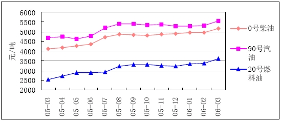 2006年,受各種因素作用的影響,國(guó)際油價(jià)持續(xù)在高位波動(dòng),3月份,布倫特原油(普氏現(xiàn)貨,下同)價(jià)格為61.2 美元/桶,同比上漲15.4%。成品油價(jià)格繼續(xù)上漲,95#無(wú)鉛汽油為68.9 美元/桶,同比上漲15.9%;柴油77.6 美元/桶,同比上漲16.1%。為緩解國(guó)內(nèi)成品油與原油價(jià)格倒掛的矛盾,3 月26 日,發(fā)展改革委再次提高成品油出廠價(jià)格,汽油、柴油價(jià)格分別提高300 元和200 元,調(diào)整后出廠價(jià)格分別為4700 元/噸和4070 元/噸,隨后,各地成品油價(jià)格紛紛上揚(yáng)。3 月末,國(guó)內(nèi)市場(chǎng)0 號(hào)柴油價(jià)格平均為5179 元/噸,比2 月提高4.26%;國(guó)內(nèi)市場(chǎng)90 號(hào)汽油價(jià)格平均為5567 元/噸,比2 月份提高4.5%;20 號(hào)燃料油價(jià)格為3615 元/噸,比2 月份提高6.76%。國(guó)家調(diào)高成品油價(jià)格效應(yīng)顯現(xiàn)。