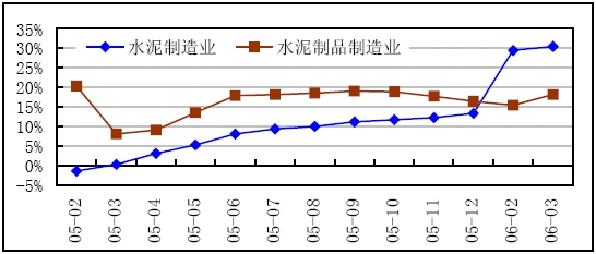 水泥制品制造業(yè)的產(chǎn)銷情況不如水泥制造業(yè),2006年1季度其工業(yè)總產(chǎn)值增速比水泥制造業(yè)低12.33 個(gè)百分點(diǎn),產(chǎn)品銷售收入增速比水泥制造業(yè)低10.69 個(gè)百分點(diǎn)。雖然水泥制品制造業(yè)的產(chǎn)銷增長(zhǎng)情況不如整個(gè)水泥制造業(yè),但是其產(chǎn)銷增幅還是好于去年同期。