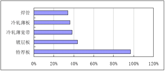 到2006年3月末,全國鋼鐵產(chǎn)品中,特厚板的產(chǎn)量增長速度最快,共生產(chǎn)78萬噸,增長96.8%,增加產(chǎn)量38萬噸。其余依次是:鍍層板(帶)272萬噸,增長43.9%,增加產(chǎn)量83萬噸;冷軋薄寬鋼帶271萬噸,增長38.1%,增加75萬噸;冷軋薄板237萬噸,增長36.3%,增加63萬噸;焊管462萬噸,增長34.3萬噸,增加118萬噸;電工鋼板(帶)生產(chǎn)79萬噸,增長34%,增加產(chǎn)量20萬噸;熱軋無縫管324萬噸,增長33%,增加80萬噸;熱軋薄寬鋼帶321萬噸,增長28.2%,增加產(chǎn)量70萬噸;棒材825萬噸,增長26.2%,增加171萬噸;厚鋼板284萬噸,增長24.8%,增加57萬噸;鋼筋1897萬噸,增長21.6%,增加337萬噸;中厚寬鋼帶1052萬噸,增長21.2%,增加184萬噸;中板520萬噸,增長19.5%,增加85萬噸;中小型型鋼638萬噸,增長17.7%,增加96萬噸;盤條1589萬噸,增長17.5%,增加236萬噸;冷軋窄鋼帶95萬噸,增長14.9%,增加12噸;熱軋窄鋼帶681萬噸,增長9.5%,增加59萬噸;大型型鋼216萬噸,增長2.9%,增加6萬噸。截止3月末,全國品種鋼材中只有熱軋薄板同比降低9.2%,產(chǎn)量為71萬噸,減少產(chǎn)量7萬噸。
