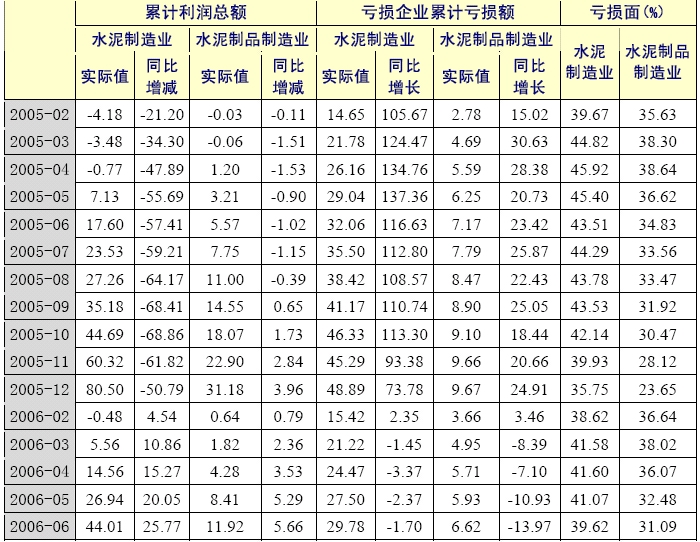2006年1-6月,水泥制造業(yè)累計(jì)利潤(rùn)總額為44.01億元,比上年同期增加了25.77億元;虧損企業(yè)累計(jì)虧損總額為29.78億元,比上年下降了1.70%;企業(yè)虧損面仍然較大,為39.62%,但是比上年同期下降了3.89個(gè)百分點(diǎn)。