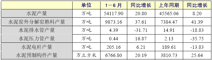 2006年1-6月,水泥累計生產(chǎn)54117.90萬噸,同比增長20.80%,4、5、6月份月產(chǎn)量更是連續(xù)突破1億噸;水泥窯外分解窯熟料生產(chǎn)9873.16萬噸,同比增長37.61%;水泥排水管生產(chǎn)4.39萬噸,同比增長-31.71%;水泥壓力管生產(chǎn)0.44萬噸,同比增長16.87%;水泥電桿生產(chǎn)205.16萬噸,同比增長6.21%;水泥預(yù)制構(gòu)件生產(chǎn)6766.80萬立方米,同比增長20.19%。 總體來看,1-6月,水泥窯外分解窯熟料產(chǎn)量同比增長速度最快,水泥排水管產(chǎn)量比上年同期大幅下降。
