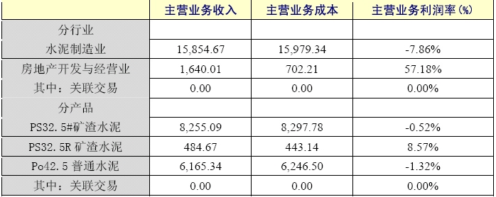 2006年1-9月,天津水泥股份有限公司累計(jì)生產(chǎn)水泥96.7萬噸,比上年同期增加16.7萬噸,同比增長20.88%;水泥銷量累計(jì)80.8萬噸,比上年同期增加16.5萬噸,增長25.66%;另一項(xiàng)主業(yè)房地產(chǎn)開發(fā)收入為1640萬元,同比減少1672.8萬元,下降50.5%。 由于水泥主業(yè)產(chǎn)銷規(guī)模增長,使三季度的主營業(yè)務(wù)收入同比略有增加,1-9月實(shí)現(xiàn)主營業(yè)務(wù)收入17494.7萬元,比上年同期增加698.7萬元,增長4.16%。其中:水泥產(chǎn)品銷售收入15854.7萬元,同比增加2371.7萬元,增長17.59%;房地產(chǎn)開發(fā)收入1640萬元,同比減少1672.8萬元,下降50.5%,主要因新開發(fā)項(xiàng)目尚未完全形成銷售所致;1-9月實(shí)現(xiàn)主營業(yè)務(wù)利潤為813萬元,比上年同期減少113萬元,下降12.2%,其中:水泥產(chǎn)品銷售利潤為虧損125萬元,同比增虧78萬元,主要是因產(chǎn)品結(jié)構(gòu)調(diào)整導(dǎo)致平均售價(jià)同比下降幅度高于平均成本同比下降幅度。由于公司報(bào)告期內(nèi)主營業(yè)務(wù)利潤偏低,期間費(fèi)用同比增加,承擔(dān)期間費(fèi)用后的營業(yè)利潤為虧損2688.4萬元,同比增虧726萬元;由于報(bào)告期內(nèi)公司取得的補(bǔ)貼收入1468萬元,抵補(bǔ)了部分營業(yè)利潤的虧損,使公司1-9月實(shí)現(xiàn)利潤為虧損1188萬元,比上年同期增虧438萬元,增幅為58.4%;公司1-9月凈利潤為虧損1194萬元,同比增虧262萬元,增幅28.15%。