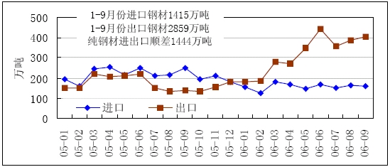2005年1月-2006年9月全國鋼材進出口逐月走勢
