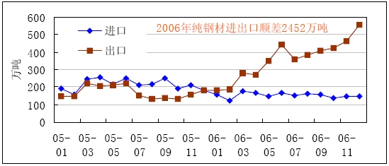 根據(jù)發(fā)展態(tài)勢初步預(yù)測,2007年我國鋼材進(jìn)口量將維持在1800萬噸左右,鋼材出口將達(dá)到6000萬噸左右,總體貿(mào)易順差將高達(dá)4200萬噸左右,即凈出口量約占估算生產(chǎn)總量5億噸的8.4%左右,再創(chuàng)歷史新高。