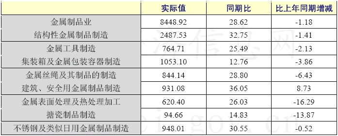 2006年,截止四季度末,金屬制品業(yè)共完成工業(yè)總產(chǎn)值8448.9億元,同比增長28.62%,增速比上年同期下降了1.18個百分點(diǎn)。