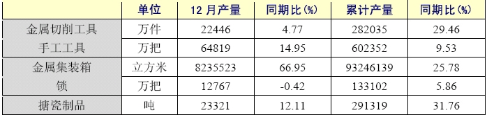 2006年,金屬制品業(yè)主要產(chǎn)品產(chǎn)量大多保持穩(wěn)定增長(zhǎng)。從12月份增長(zhǎng)情況看,增長(zhǎng)較快的產(chǎn)品分別為金屬集裝箱(66.95%]、手工工具(14.95%]、搪瓷制品(12.11%]。從全年累計(jì)增長(zhǎng)情況,增長(zhǎng)較快的產(chǎn)品分別是搪瓷制品(31.76%]、金屬切削工具(29.46%)、金屬集裝箱(25.78%)。