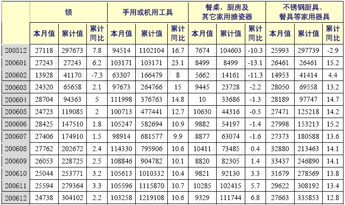 從出口產(chǎn)品看,主要金屬制品的出口增長(zhǎng)比較平穩(wěn)。其中,鎖累計(jì)出口30.4萬(wàn)噸,同比增長(zhǎng)2.2%,手用或機(jī)用工具出口121.9萬(wàn)噸,同比增長(zhǎng)10.6%,不銹鋼廚具、餐具等家用器具出口33.6萬(wàn)噸,同比增長(zhǎng)12.8%。