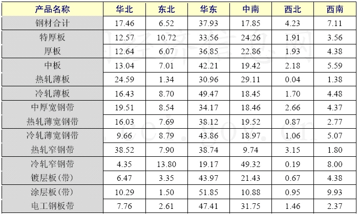 2006年,華東、華北和中南地區(qū),是全國鋼材生產(chǎn)和銷售的主要集散地;東北地區(qū)的鋼材產(chǎn)量主要南下;西北、西南地區(qū)的鋼材生產(chǎn)和消費水平較低。2006年重點鋼鐵企業(yè)的產(chǎn)品地區(qū)流向主要是:華北地區(qū)占17.46%、華東地區(qū)37.93%,中南地區(qū)17.85%,西北地區(qū)4.23%、西南地區(qū)占7.11%、東北地區(qū)6.52%。從主要產(chǎn)品流向可見,板帶材流向更加集中,華東地區(qū)消費的板帶材所占的比例更高,涂層板帶占51.85%,冷軋薄板占49.47%,鍍層板帶和電工鋼分別占43.97%和47.41%,冷軋薄寬帶為43.86%。