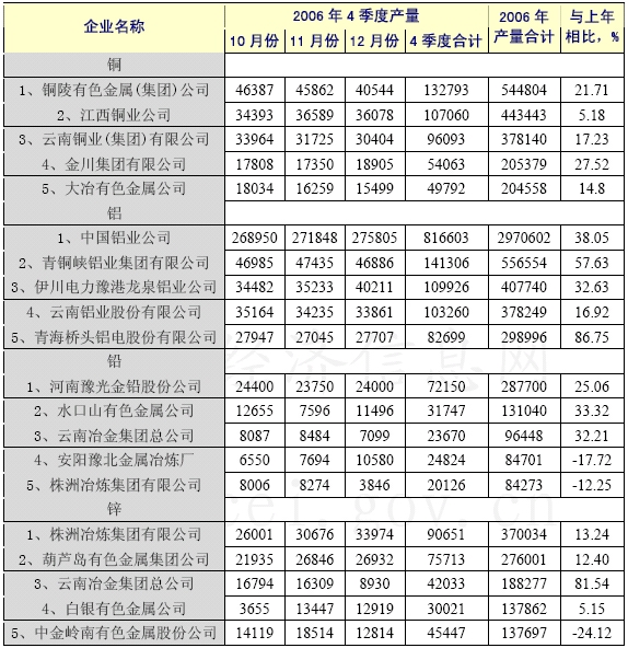 2006年4季度各主要有色金屬品種排名前5企業(yè)產(chǎn)量情況