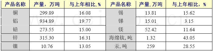 十種有色金屬產(chǎn)品中,產(chǎn)量增長(zhǎng)的有9種,產(chǎn)量下降的只有汞。其中鋁產(chǎn)量增幅比2005年上升2.75個(gè)百分點(diǎn),鋅產(chǎn)量增幅比2005年上升8.71個(gè)百分點(diǎn),錫產(chǎn)量增幅比2005年上升13.61個(gè)百分點(diǎn);鎳產(chǎn)量增幅比2005年回落13.24個(gè)百分點(diǎn),銻產(chǎn)量增幅比2005年回落13.35個(gè)百分點(diǎn),海綿鈦產(chǎn)量增幅比2005年回落43.76個(gè)百分點(diǎn)。