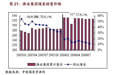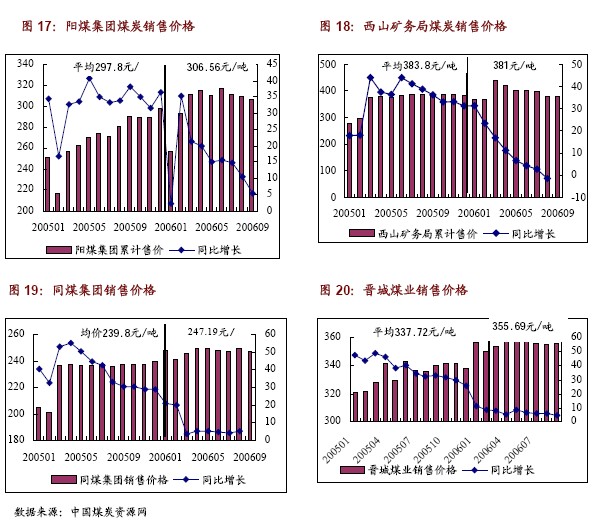 從山西煤炭企業(yè)的銷售價格來看,2006年前9 個月,陽煤集團、西山礦務局、同煤集團、晉城煤業(yè)和潞安集團的銷售價格分別為306.56 元/噸、381 元/噸、247.19 元/噸、355.69 元/噸和327.22 元/噸,較05 年均價分別增長8.76 元/噸,-2.41 元/噸(煉焦煤價格壓力較大)、7.39 元/噸、17.97 元/噸和40.47 元/噸(潞安加大了煙煤噴吹銷量)。除了西山礦務局的價格小幅下跌外,其他四大集團的價格都有不同程度的上漲。