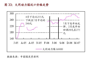 ?? 07年4 月30,大同動(dòng)力煤坑口價(jià)(不含稅)為275 元/噸,較1 月份的高點(diǎn)295 元/噸下降了20 元/噸。目前價(jià)格較06 年7 月份的低點(diǎn)240 元/噸上漲了35 元/噸,漲幅達(dá)到14.58%,基本穩(wěn)定。