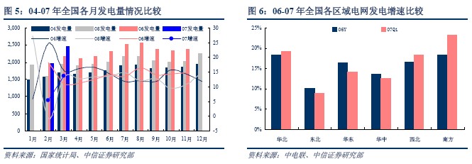 2007年1~3 月全國(guó)發(fā)電量為7,012 億kWh,同比增15.5%(單月增速13.7%),
