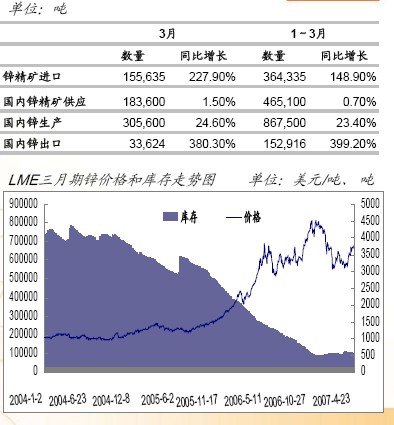 1~3月份我國凈出口精鋅15.29萬噸,同比增長399.20%。2006年11月鋅現(xiàn)貨升水保持在100美元左右,進(jìn)入2007年后,現(xiàn)貨升水開始下降,目前,鋅現(xiàn)貨僅升水15-21美元/噸。