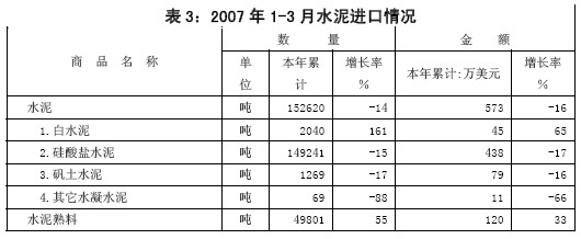 2007年1-3月全國共進口水泥熟料49801噸,同比增長55%;共進口水泥152620噸,同比減少了14%,其中用途最廣的硅酸鹽水泥進口149241噸,同比減少15%。具體情況見下表。若按1美元=7.72元人民幣估算,硅酸鹽水泥的平均進口單價為226.57元人民幣/噸,水泥熟料的平均進口單價為186.02元人民幣/噸。