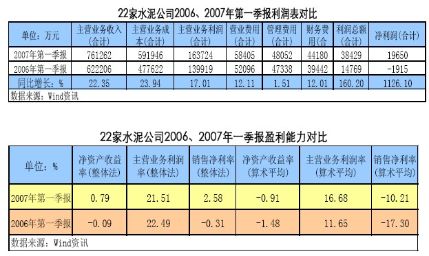 相對(duì)來(lái)說(shuō),一季度是水泥行業(yè)的淡季。2007年一季度水泥行業(yè)表現(xiàn)出淡季不淡的特點(diǎn),這從上市公司公布的季報(bào)中也反映出來(lái)。