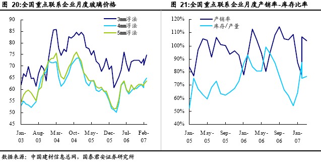 類似于水泥,2007年4 月份玻璃價格環(huán)比回升,其中3mm、4mm、5mm 價格分別同比回升6.1%、3.1%、2.4%。從季節(jié)性需求差異的角度理解,玻璃和水泥一樣每年第一季度因建筑施工減少、春節(jié)長假和設(shè)備檢修等因素,玻璃需求相對較小,進入4月份后,隨著天氣轉(zhuǎn)暖建筑施工引致玻璃需求增加,玻璃價格開始季度性的復蘇。 4 月份玻璃產(chǎn)銷率仍維持在104%的高水平,庫存率77%尚處適當水平。