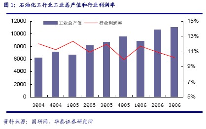2006 年前三季度,石油化工行業(yè)作為我國(guó)宏觀經(jīng)濟(jì)的基礎(chǔ)和支柱產(chǎn)業(yè),繼續(xù)在自身的發(fā)展慣性作用下保持穩(wěn)定增長(zhǎng),但其增長(zhǎng)速度相對(duì)于2004-2005 年高速增長(zhǎng)期已經(jīng)有所回落。石化行業(yè)工業(yè)總產(chǎn)值已經(jīng)連續(xù)兩個(gè)季度突破萬(wàn)億元大關(guān),但需要關(guān)注的是,行業(yè)利潤(rùn)率在波動(dòng)中已經(jīng)開(kāi)始出現(xiàn)了下滑的趨勢(shì),預(yù)計(jì)今年石化行業(yè)的行業(yè)利潤(rùn)率在10.5%左右,相比于去年的11.3%下降近一個(gè)百分點(diǎn)。這一利潤(rùn)率指標(biāo)的走向直接反映了石油化工行業(yè)在經(jīng)歷了近期高峰以后,開(kāi)始進(jìn)入景氣回落周期。