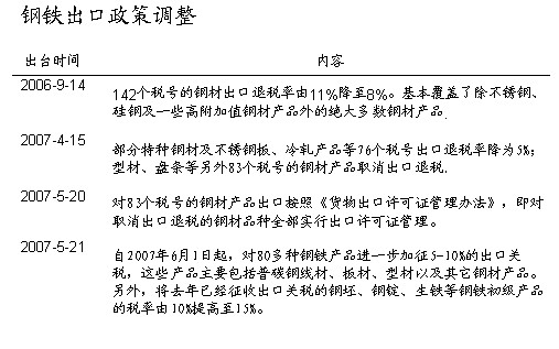 在鋼鐵宏觀調(diào)控中,國(guó)家對(duì)鋼鐵產(chǎn)品出口政策先后進(jìn)行多次調(diào)整。2007年4、5月間連續(xù)三次出臺(tái)限制鋼鐵產(chǎn)品出口政策,引起了行業(yè)內(nèi)外相關(guān)人士的震動(dòng)。由于限制鋼鐵出口政策影響市場(chǎng)心理,再加上目前正處于鋼鐵消費(fèi)淡季,07年7到9月間鋼價(jià)會(huì)有所下降。