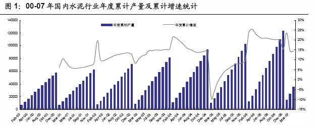 2007年1-4月,國內(nèi)水泥累計(jì)產(chǎn)量為3.59億噸,同比增長為14.4%,增幅同比下降7.4個(gè)百分點(diǎn),較06年全年增速下降1.1個(gè)百分點(diǎn)。??目前的水泥產(chǎn)量增速仍處于2000年以來的較高水平,預(yù)期07年國內(nèi)水泥產(chǎn)量增速約12-13%,盡管數(shù)值略低于06年,但仍屬于高增長的水平。