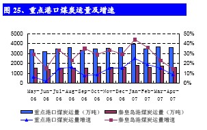 從實(shí)際運(yùn)輸情況來看,2007年1-4月,全國重點(diǎn)港口煤炭運(yùn)量為1.47億噸,同比增長了16.4%,與同期煤炭銷量基本一致,預(yù)計(jì)全年港口運(yùn)輸仍將基本滿足需求。