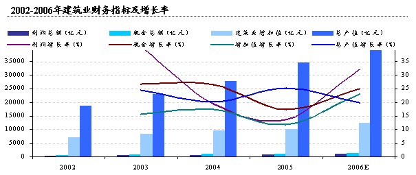 從建筑業(yè)(所有具有資質(zhì)等級的施工總承包、專業(yè)承包建筑企業(yè),但不包括勞 務(wù)分包建筑企業(yè))的統(tǒng)計數(shù)據(jù)來看,2003-2006年建筑業(yè)總產(chǎn)值穩(wěn)定增長,利 潤、稅金增長率在2005年出現(xiàn)低位拐點,建筑行業(yè)的盈利能力有所好轉(zhuǎn) 。