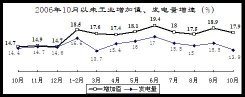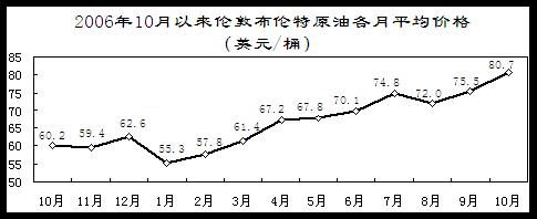 當(dāng)月全國原油產(chǎn)量同比增長1.9%;原油加工量增長6%,增速比上月加快0.3個百分點(diǎn),其中汽油、柴油產(chǎn)量均增長4.7%。天然氣產(chǎn)量增長24.3%,比上月減緩5.6個百分點(diǎn)。國際原油價格繼續(xù)上漲。當(dāng)月布倫特原油平均價格80.7美元/桶,比上月上漲5.2美元/桶,同比上漲20.5美元/桶,漲幅分別為7%和34.2%。受國際油價快速上漲、國內(nèi)油價調(diào)整預(yù)期增強(qiáng)等影響,部分地區(qū)成品油供應(yīng)趨緊。1-10月,全國原油產(chǎn)量15573萬噸,增長1.4%;進(jìn)口原油13668萬噸(海關(guān)統(tǒng)計(jì)),增長13.8%;原油加工量26993萬噸,增長6.6%,其中汽油、柴油產(chǎn)量分別增長7.7%和5.8%。天然氣產(chǎn)量561億立方米,增長20.1%。乙烯產(chǎn)量增長14.3%,燒堿、純堿產(chǎn)量分別增長15.8%和11%,化肥、農(nóng)藥產(chǎn)量分別增長13.6%和21.3%。
