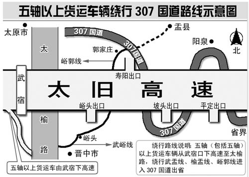 太舊高速公路全線雙向晝夜禁止5軸(含5軸、懸浮軸)以上貨運(yùn)車(chē)輛通行。該如何繞行呢?交警提示,5軸(含5軸以上)貨運(yùn)車(chē)輛從武宿口下高速至太榆路,繞行武盂、榆盂線,峪郭線,進(jìn)入307國(guó)道出省。