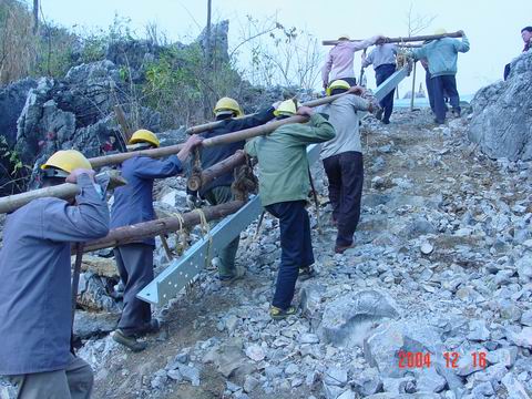 工程施工人員運(yùn)用人扛、馬馱、索道牽拉等多種方法往山上運(yùn)輸塔材 艱難起步 百轉(zhuǎn)千回始見(jiàn)金