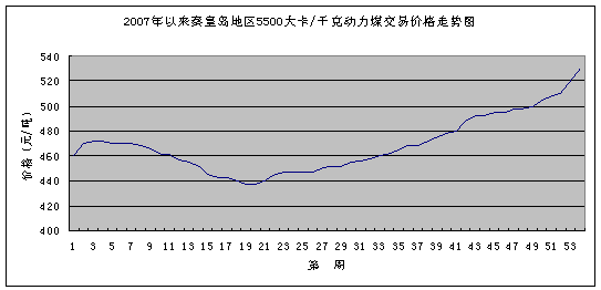 2007年底,秦皇島地區(qū)市場動力煤交易價(jià)格曾經(jīng)出現(xiàn)了一輪加速上漲過程,在三、四天的時(shí)間內(nèi),具有代表性的發(fā)熱量5500大卡/千克動力煤的平倉價(jià)格上漲了10元/噸,達(dá)到510-520元/噸。