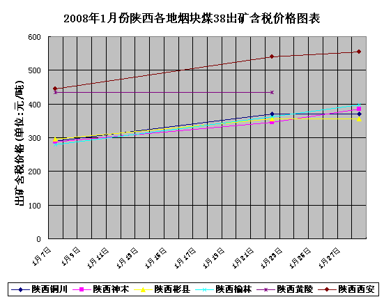 2008年1月份陜西各地?zé)熋簤K38出礦含稅價(jià)格整體呈上揚(yáng)趨勢(shì)