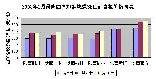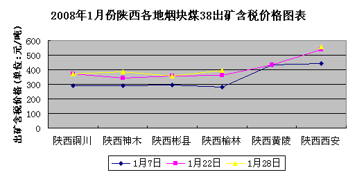 2008年1月份陜西各地?zé)熋簤K38出礦含稅價(jià)格除陜西黃陵地區(qū)價(jià)格基本保持平穩(wěn)外,整體呈上揚(yáng)趨勢(shì)。1月份各地?zé)熋簤K38整體波幅在60-120元/噸。上半月各地?zé)熋簤K38上行相對(duì)較快,整體攀幅在60-95元/噸。下半月漲勢(shì)趨緩,攀幅在40元/噸左右。