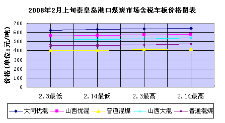 大同優(yōu)混煤車板含稅價格相對高位,價格位居秦皇島港口各煤炭品種價格首位。2008年2月上旬大同優(yōu)混煤車板含稅價格整體呈現(xiàn)上揚趨勢,含稅車板最低價格由2月3日的625元/噸攀升至2月14日635元/噸,攀幅10元/噸。含稅車板最高價格由2月3日的640元/噸攀升至2月14日645元/噸,攀幅5元/噸。