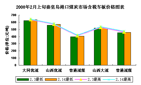 普通混煤價格相對低位。2008年2月上旬普通混煤車板含稅價格整體呈現(xiàn)上揚趨勢,含稅車板最低價格由2月3日的455元/噸攀升至2月14日460元/噸,攀幅5元/噸。含稅車板最高價格由2月3日的465元/噸攀升至2月14日475元/噸,攀幅10元/噸。