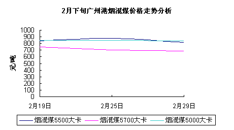 2月中下旬廣州港煤炭價(jià)格整體呈下行走勢,但整體下行幅度不大,除煙混煤5000大卡月中至月底下行走軟60元/噸外,煙混煤5500大卡,煙混煤5700大卡分別下行20元/噸與10元/噸,波幅不大。