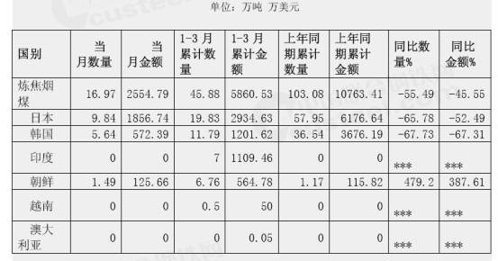 2008年3月份我國煉焦煤出口分國別統(tǒng)計數(shù)據(jù)