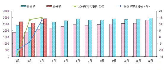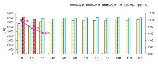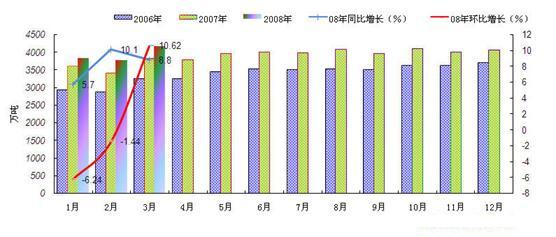 據(jù)最新生產(chǎn)統(tǒng)計數(shù)據(jù)顯示:2008年3月份,全國焦炭產(chǎn)量為2904.29萬噸,較2月份的2571.33萬噸增加了332.96萬噸,環(huán)比增加了12.95%,本月比去年同期增加了378.78萬噸,同比增長15%。2008年1-3月份累計生產(chǎn)焦炭約7156.11萬噸,與去年相比,增加了13.6%,再創(chuàng)歷史新高。參考圖4: