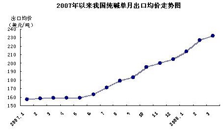 據(jù)海關統(tǒng)計,2008年1季度我國累計出口純堿46.7萬噸,價值1億美元,比去年同期(下同)分別增長4.1%和47.5%,出口平均價格為224.5美元/噸,同比上漲41.7%。其出口主要特點是: