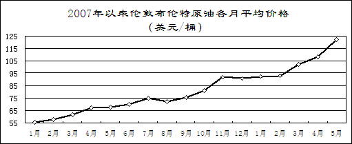 5月份,全國原油產(chǎn)量同比增長1.8%,增速比上月加快1.5個百分點;原油加工量下降1.1%,其中汽油產(chǎn)量下降6.4%,柴油產(chǎn)量增長2.6%。天然氣產(chǎn)量增長12%,減緩1.4個百分點。國際油價不斷攀高。WTI原油價格5月22日一度達到135.03美元/桶,為全月最高水平,再創(chuàng)歷史新高。當(dāng)月布倫特原油平均價122美元/桶,比上月上漲13.2美元/桶,漲幅為12.2%;同比上漲54.2美元/桶,漲幅為80%。