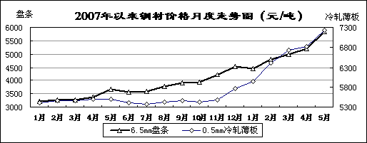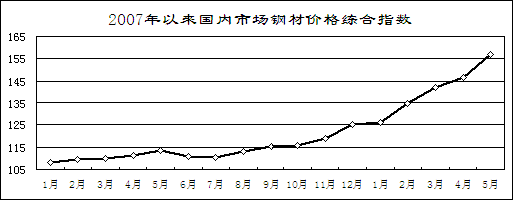 5月份,全國粗鋼產(chǎn)量同比增長10.5%,增速比上月加快0.3個百分點;鋼材產(chǎn)量增長13.6%,加快1.9個百分點。鋼材出口556萬噸,比上月增加78萬噸;進口2萬噸,與上月持平。鋼材價格漲勢不減。月末,國內(nèi)市場鋼材價格綜合指數(shù)156.86點,比上月末上漲10.38點,比年初上漲31.74點,同比上漲43.52點。6.5mm盤條、10mm中板、0.5mm冷軋薄板平均價分別為5832元/噸、6702元/噸和7221元/噸,比上月末上漲12%、6.2%和6%,同比上漲59.1%、47.7%和31.6%。
