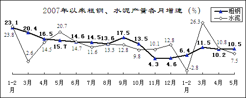 5月份,主要工業(yè)行業(yè)運行態(tài)勢較好。能源生產(chǎn)供應(yīng)基本平穩(wěn),部分地區(qū)供需緊張狀況仍存在;冶金、有色、建材行業(yè)生產(chǎn)過快增長情況得到遏制;機械、電子行業(yè)繼續(xù)較快增長;紡織、輕工等行業(yè)出口增幅有所回升。前5個月,行業(yè)效益水平出現(xiàn)分化。煤炭行業(yè)利潤增長97.8%;冶金、建材、醫(yī)藥行業(yè)利潤增速超過40%;機械、電子和輕工行業(yè)利潤增幅27.1%-36.9%;有色、紡織行業(yè)分別增長9.2%和3.5%;電力、石化行業(yè)利潤下降。