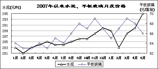 5月份,全國水泥產(chǎn)量同比增長7.5%,增速比上月減緩3.3個百分點;平板玻璃產(chǎn)量增長14.3%,加快7.2個百分點。水泥價格上漲較多,平板玻璃價格回落。當(dāng)月重點建材企業(yè)水泥平均出廠價295元/噸,比上月上升5元/噸,同比上升10元/噸;平板玻璃出廠價66元/重量箱,比上月回落2元/重量箱,同比上升3元/重量箱。