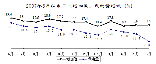 發(fā)電量增速減緩,效益明顯下降。上半年,全國發(fā)電量16803億千瓦時,同比增長12.9%,增速同比減緩3.1個百分點;其中,火電、水電分別增長11.7%和18.5%。區(qū)域性、季節(jié)性電力緊張?zhí)卣鞲用黠@。今年以來,先后有20個省級電網(wǎng)出現(xiàn)拉限電;入夏以來,南方電網(wǎng)供電持續(xù)緊張,河北南網(wǎng)、山西、遼寧、河南、重慶等地出現(xiàn)拉限電。預計夏季高峰期全國最大電力缺口1000萬千瓦左右。前五個月,由于煤價上漲較多和因災損失較重,電力行業(yè)實現(xiàn)利潤173億元,下降70.8%,去年同期為增長57.6%。其中,火電行業(yè)由去年同期凈盈利269億元轉(zhuǎn)為凈虧損22.9億元;水電、供電行業(yè)利潤分別下降22.9%和52.6%,去年同期為增長5.8%和86.3%。