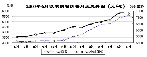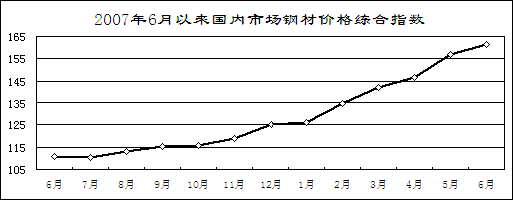鋼材價格持續(xù)上漲。6月末,國內(nèi)市場鋼材價格綜合指數(shù)161.47點,為歷史最高水平,比年初上漲36.35點,同比上漲50.76點。6.5mm盤條、16mm鋼筋價格分別為5777元/噸和5552元/噸,同比分別上漲62.4%和60.6%;10mm中板、0.5mm冷軋薄板價格分別為6793元/噸和7479元/噸,同比上漲53.2%和38.3%。前五個月,冶金行業(yè)實現(xiàn)利潤1426億元,增長50.8%。