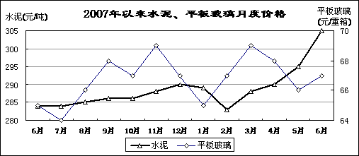 建材產(chǎn)品生產(chǎn)減速,水泥價格上漲較快。上半年,全國水泥產(chǎn)量64805萬噸,同比增長8.7%,增速同比減緩7.3個百分點;平板玻璃產(chǎn)量27520萬重箱,增長12.2%,減緩5.6個百分點。水泥價格快速上漲,平板玻璃價格高位波動。重點建材企業(yè)水泥平均出廠價6月份為305元/噸,比上月上漲10元/噸,同比上漲21元/噸;平板玻璃出廠價67元/重量箱,比上月上升1元/重量箱,同比上升2元/重量箱。前五個月,建材行業(yè)實現(xiàn)利潤361億元,增長43.6%。其中,水泥行業(yè)利潤84.1億元,增長65.4%;平板玻璃行業(yè)利潤5.7億元,增長25.4%。