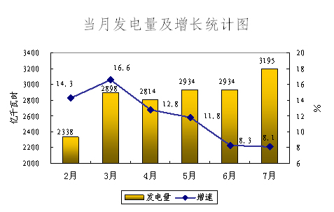 受經(jīng)濟(jì)增長放緩需求減弱、電煤供應(yīng)持續(xù)緊張、嚴(yán)重災(zāi)害以及奧運(yùn)等因素影響,2008年二季度以來,全國規(guī)模以上電廠發(fā)電量增速回落,特別是6月、7月的當(dāng)月增速回落更加明顯。6月和7月,全國規(guī)模以上電廠分別完成發(fā)電量2934億千瓦時和3195億千瓦時,同比分別增長8.3%和8.1%,增速分別比5月當(dāng)月增速下降3.5和3.7個百分點(diǎn)。