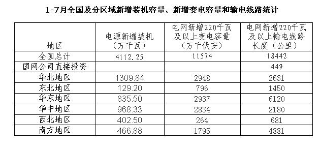 1-7月全國及分區(qū)域新增裝機(jī)容量、新增變電容量和輸電線路統(tǒng)計