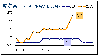 進入9月下旬后市場需求非常不錯,各企業(yè)發(fā)貨量大幅度增加,導致水泥價格也跟隨上調價格,截止10月22日哈爾濱水泥市場價格達到今年以來最高的價格360元/噸。引用牡丹江水泥股份銷售部楊經理的一句話“市場一片大好,水泥根本不愁賣”。