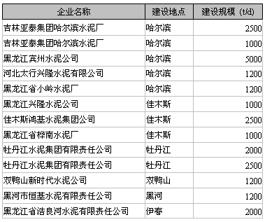 截止2008年10月中旬據(jù)新型干法水泥熟料生產線統(tǒng)計,見下表黑龍江省共有13條生產線,位于哈爾濱地區(qū)有5條;佳木斯3條;牡丹江2條;雙鴨山、黑河、伊春各1條。另外亞泰5000噸水泥熟料生產線明年將會投產。