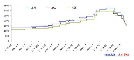 圖5:2007年6月-2008年9月部分地區(qū)焦炭?jī)r(jià)格走勢(shì)圖